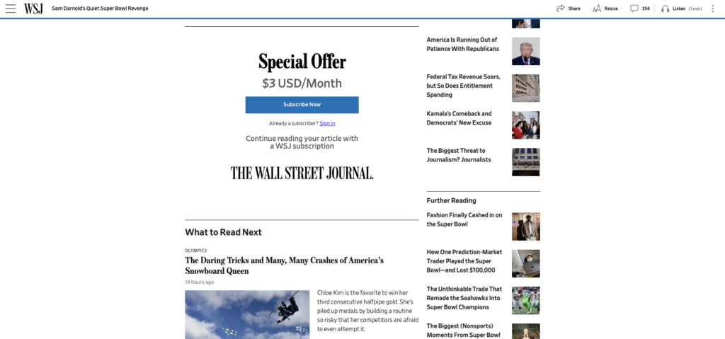 Hard paywalls work best for publishers with strong brand recognition and an established audience. The Wall Street Journal has always run a hard paywall. They know their audience can afford premium pricing, their content has clear financial value, and they don’t need to meter anything to build awareness.