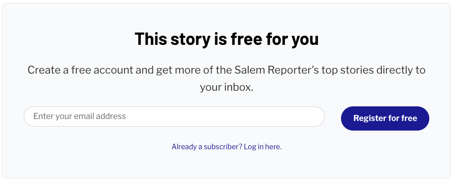 Compare that to Salem Reporter, which allows one free article per month. Your second article triggers a free registration wall. Register, and you get one more free article. Your third article requires payment. That “one-in-one” framework captures email addresses quickly and keeps upgrade messaging in front of readers consistently.